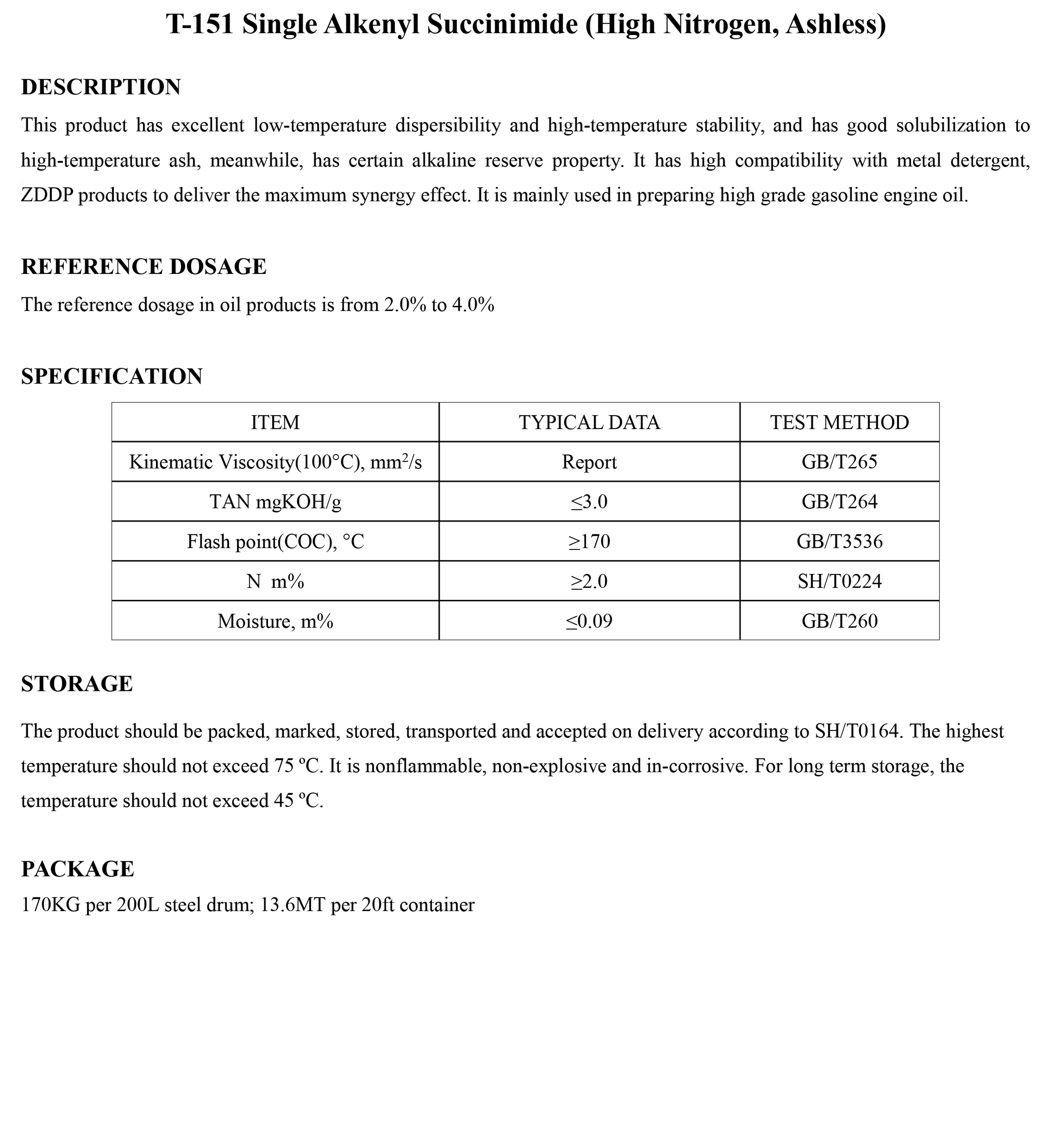 T-151 Single Alkenyl Succinimide (High Nitrogen, Ashless)-Dispersants-錦州新興石油添加劑有限責任公司